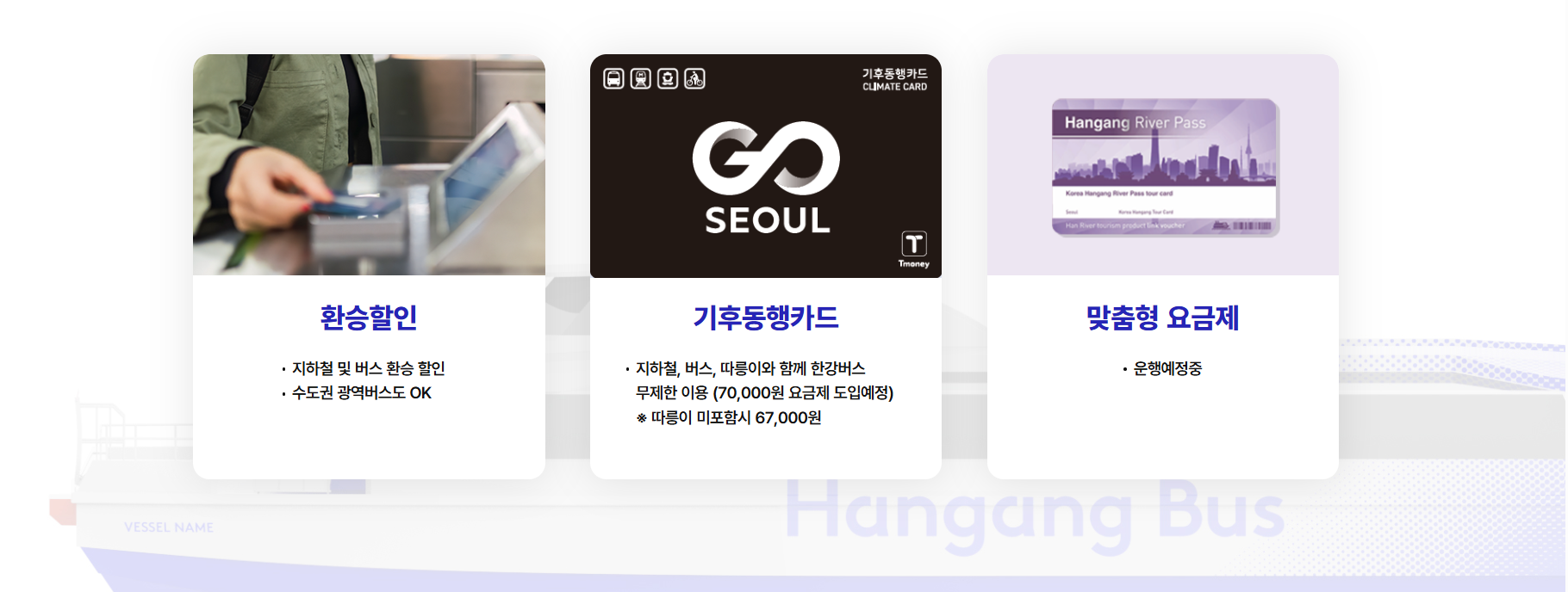 한강 수상버스 요금은 현재 다음과 같이 확정되었습니다. 지하철 및 버스, 수도권 광역버스 환승할인이 가능하고, 기후동행 card로 이용이 가능합니다. 추후 맞춤형 요금제도 운행 예정으로 준비중에 있습니다.