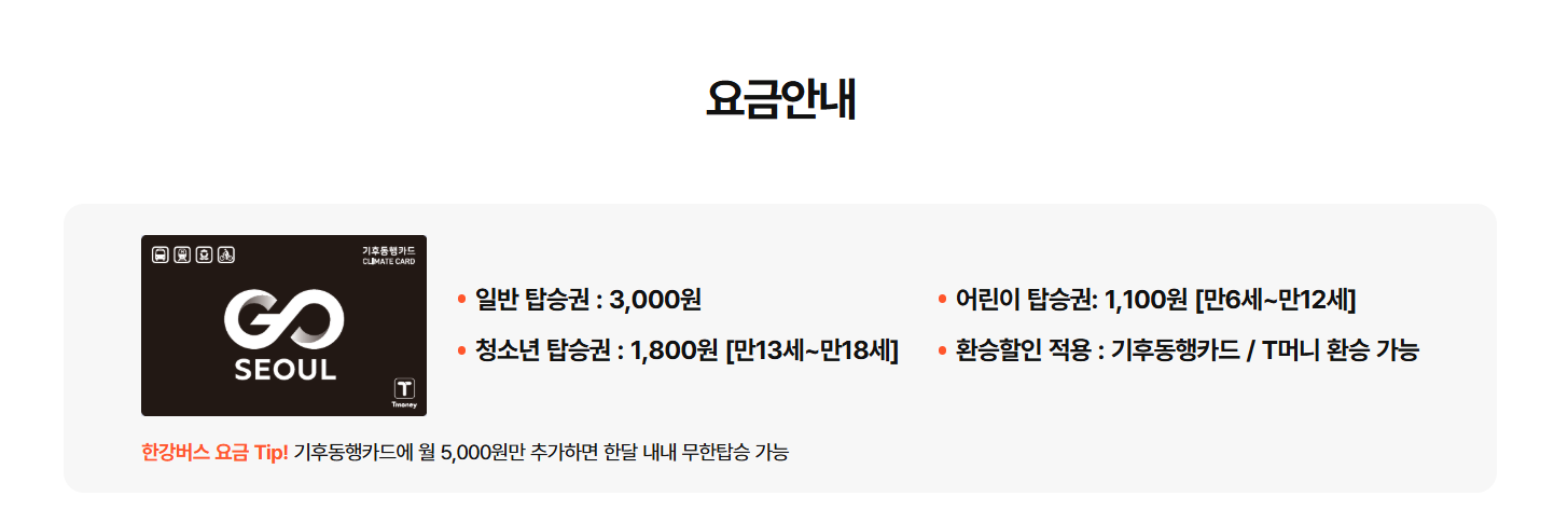 환승 할인이 적용되어 지하철, 버스, 수도권 광역버스와 환승이 가능합니다. 특히 기후동행 이용하는 경우, 월 5,000원만 추가하면 한 달 내내 무제한으로 한강버스를 탑승할 수 있습니다. 기후동행card 요금제는 따릉이 포함 시 월 70,000원, 따릉이 제외 시 월 67,000원입니다.