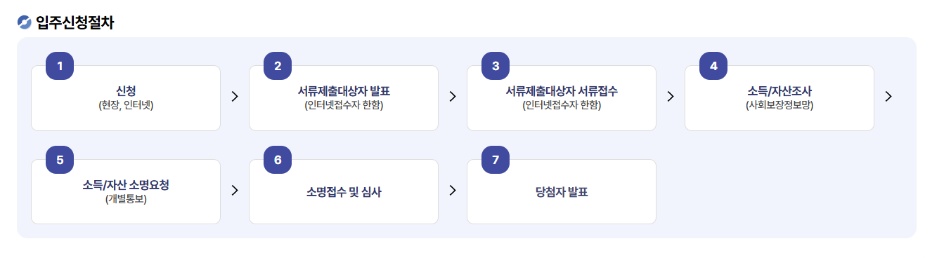 국민임대아파트 신청 절차는 크게 네 단계로 나눌 수 있습니다.