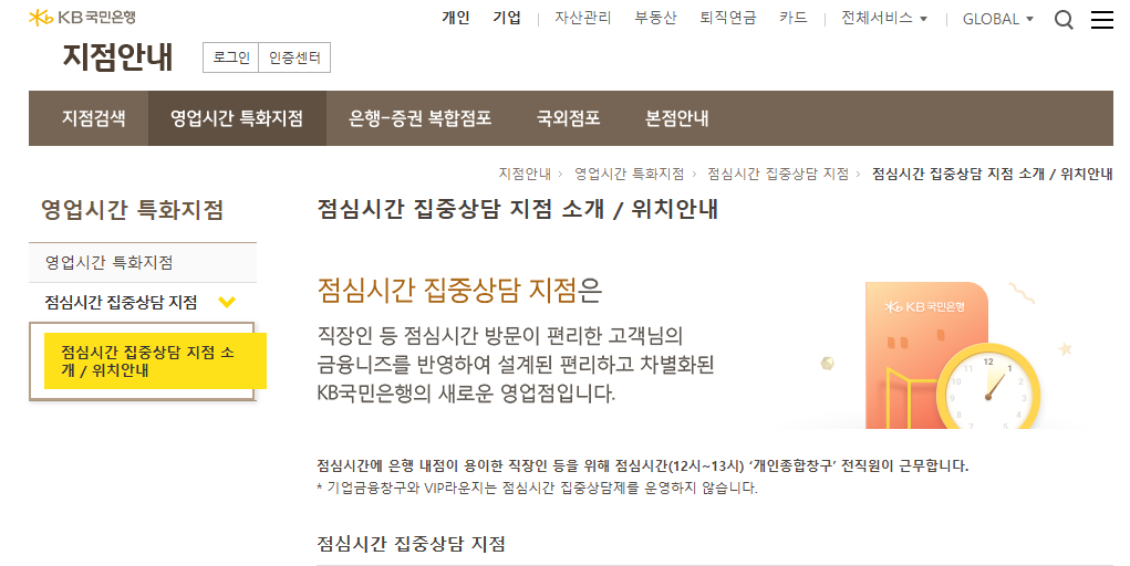 직장인의 황금 시간인 점심시간(오후 12시-1시)에 은행을 방문하면 직원들의 교대 식사 시간으로 인해 대기 시간이 길어지는 불편함이 있었습니다. KB국민은행은 이러한 불편을 해소하기 위해 점심시간 집중상담 제도를 전국 40여 개 이상의 지점에서 운영하고 있습니다.