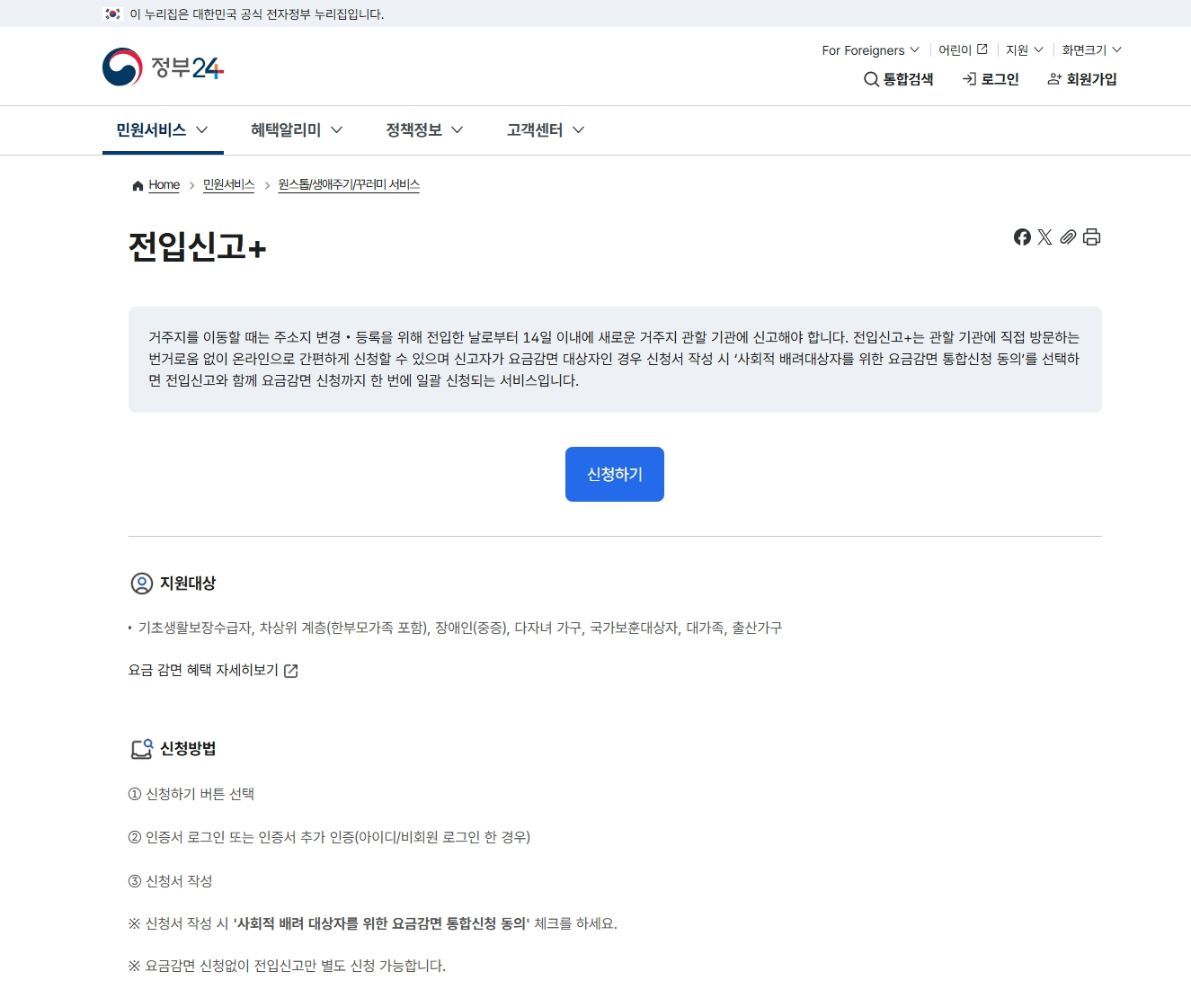 이사 후 14일이라는 기한을 넘기지 않도록 주의하고, 가급적 이사 당일 정부24를 통해 온라인으로 간편하게 신청하시기 바랍니다.