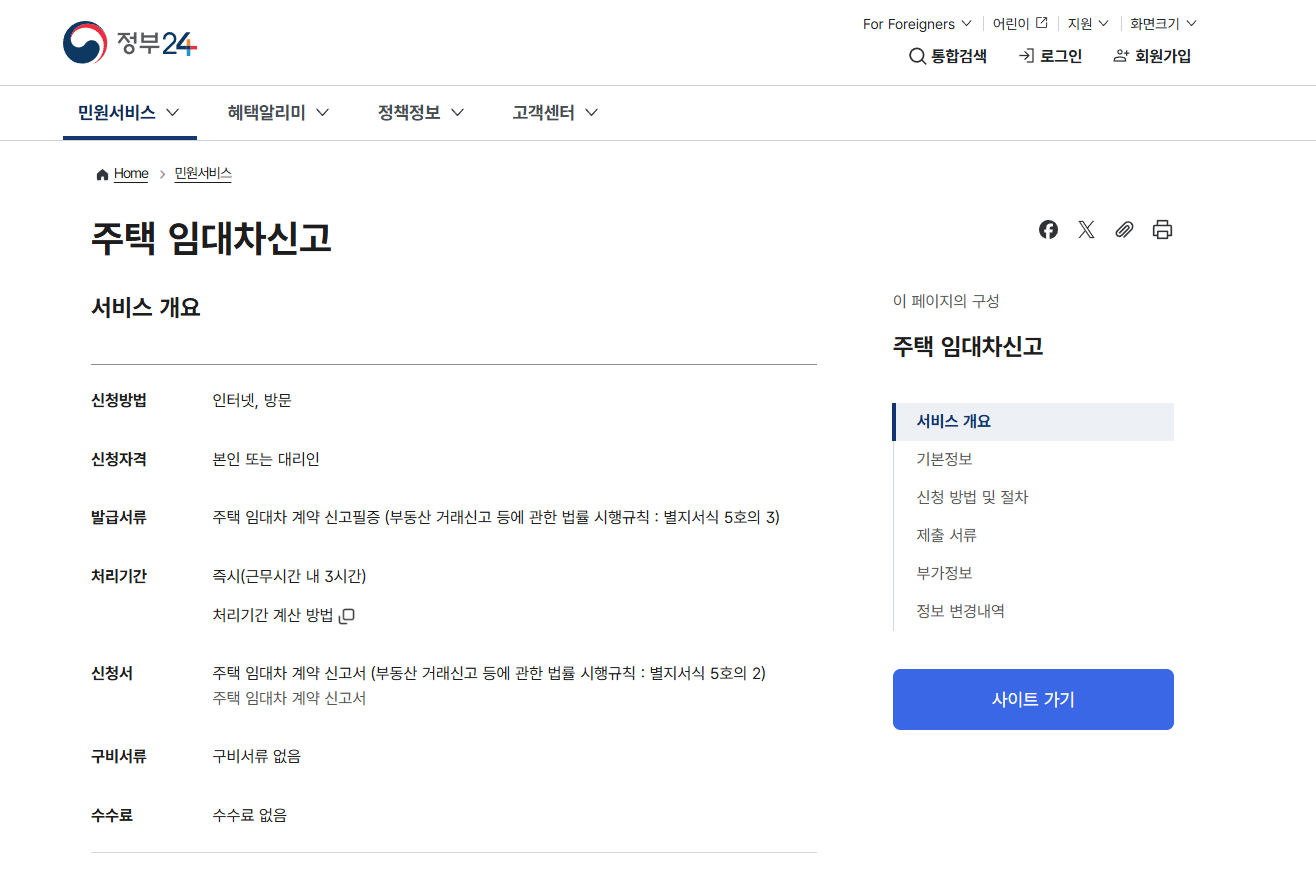보증금 6,000만 원 또는 월세 30만 원을 초과하는 계약이라면 이 신고가 의무화되어 있는데, 전입신고 과정에서 임대차 계약서를 첨부하여 함께 신고하면 별도로 확정일자를 받지 않아도 확정일자가 자동으로 부여됩니다.